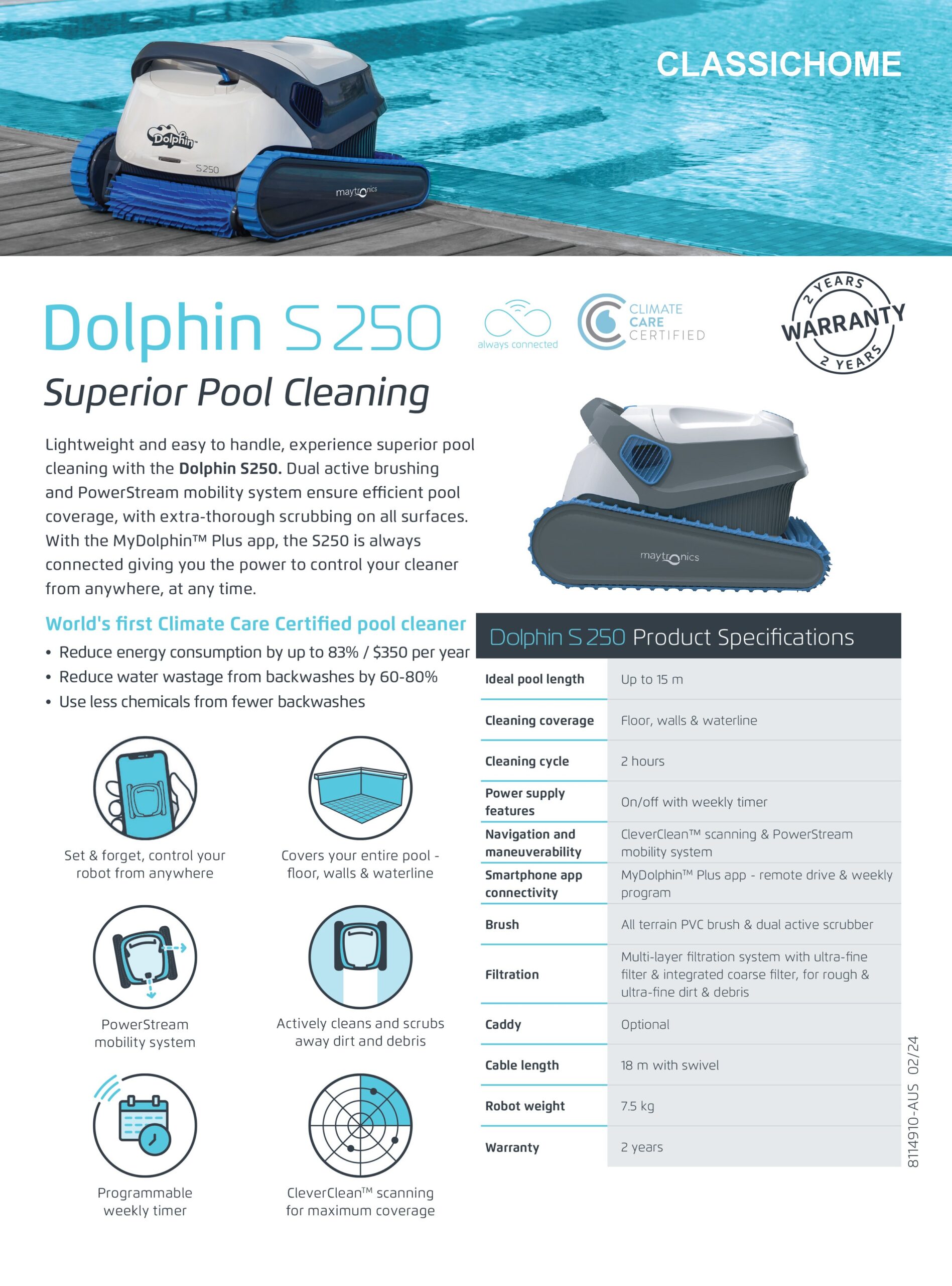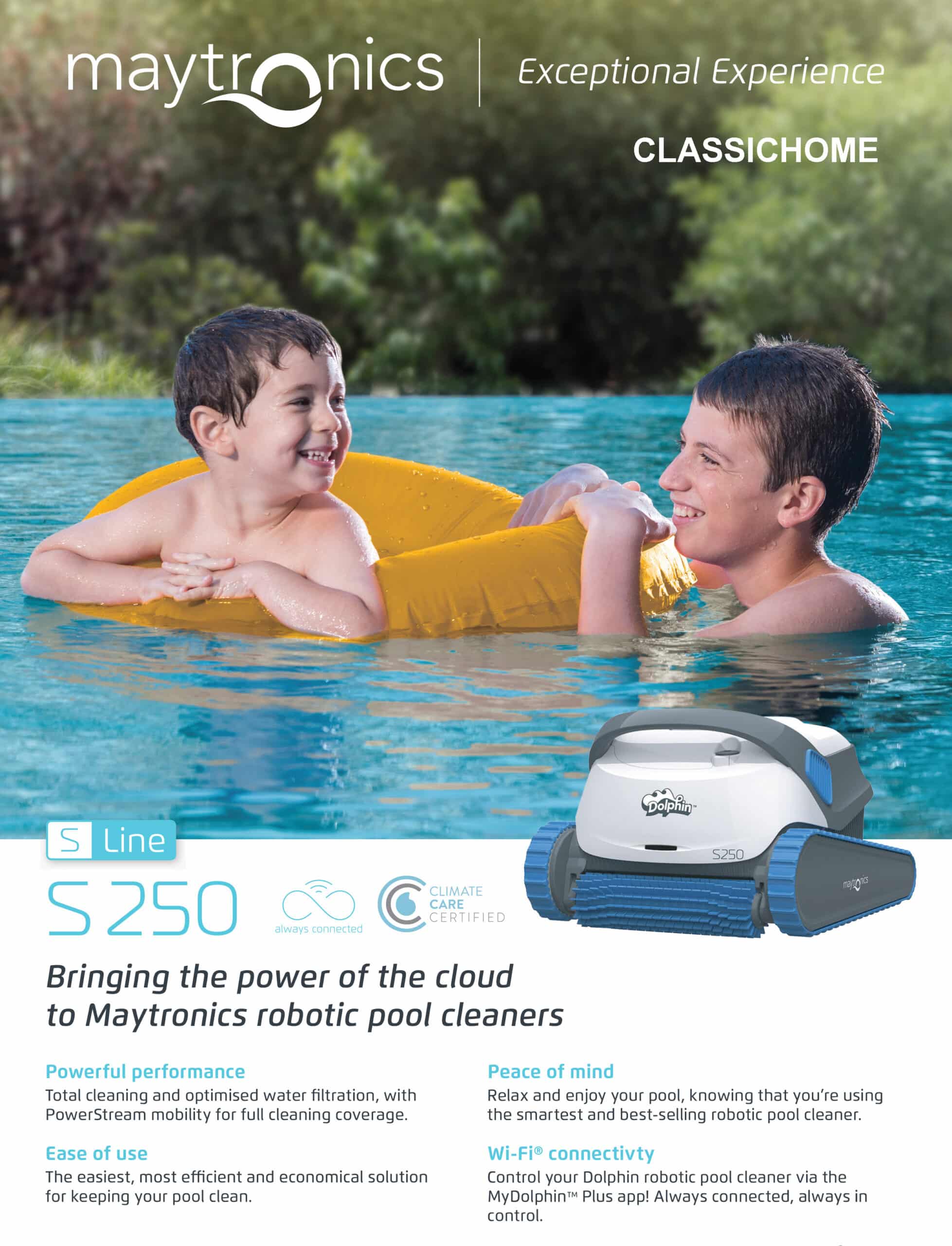 น้ำหนักเบาและใช้งานง่าย สัมผัสประสบการณ์การทำความสะอาดสระว่ายน้ำที่เหนือกว่าด้วย Dolphin S250 แปรงแบบแอคทีฟคู่และระบบการเคลื่อนที่ PowerStream ช่วยให้มั่นใจได้ถึงการครอบคลุมพื้นที่สระน้ำอย่างมีประสิทธิภาพ ด้วยการขัดอย่างละเอียดเป็นพิเศษในทุกพื้นผิว ด้วยแอป MyDolphin™ Plus S250 สามารถเชื่อมต่อได้ตลอดเวลา ทำให้คุณสามารถควบคุมเครื่องทำความสะอาดได้จากทุกที่ ทุกเวลา